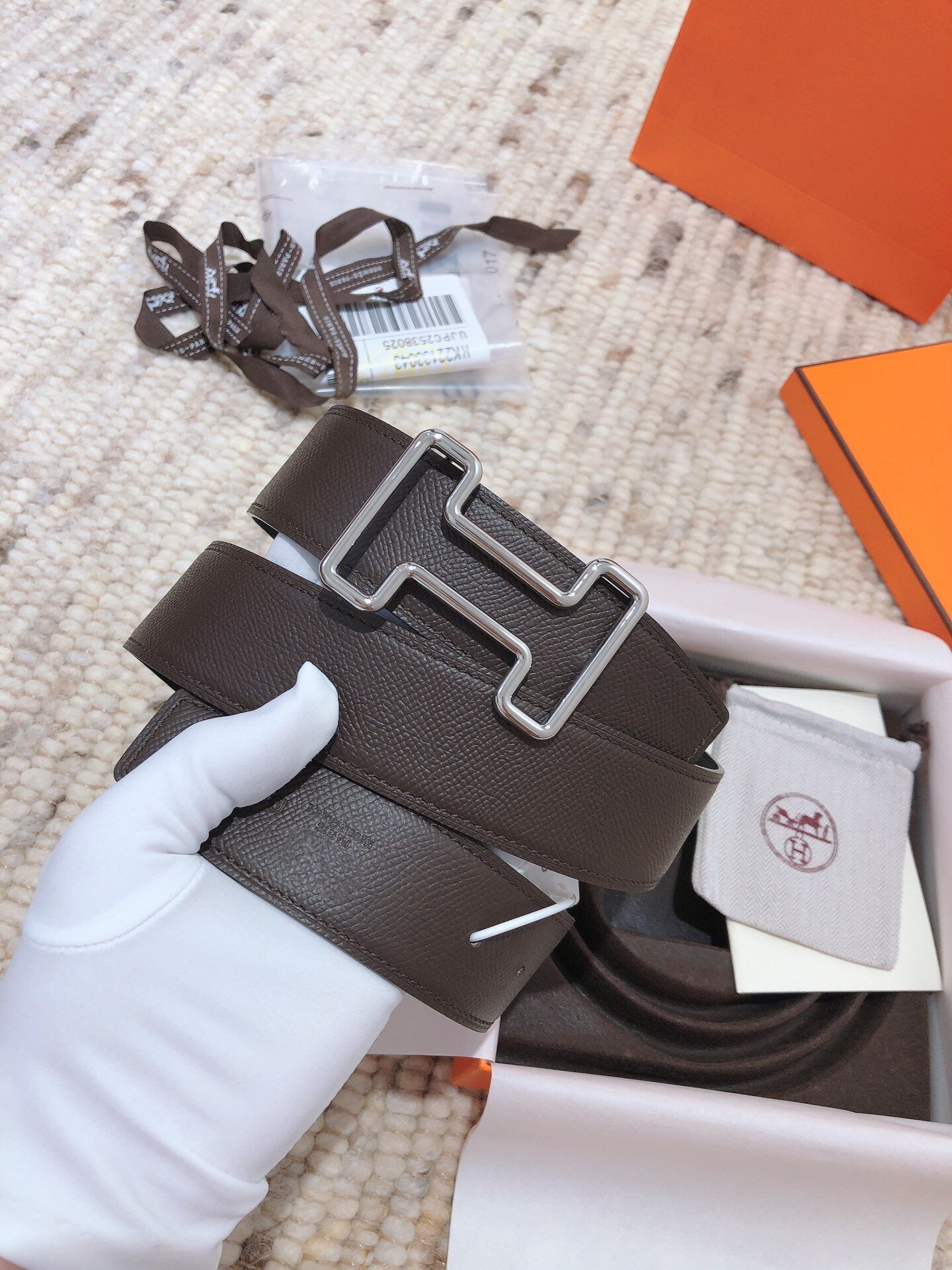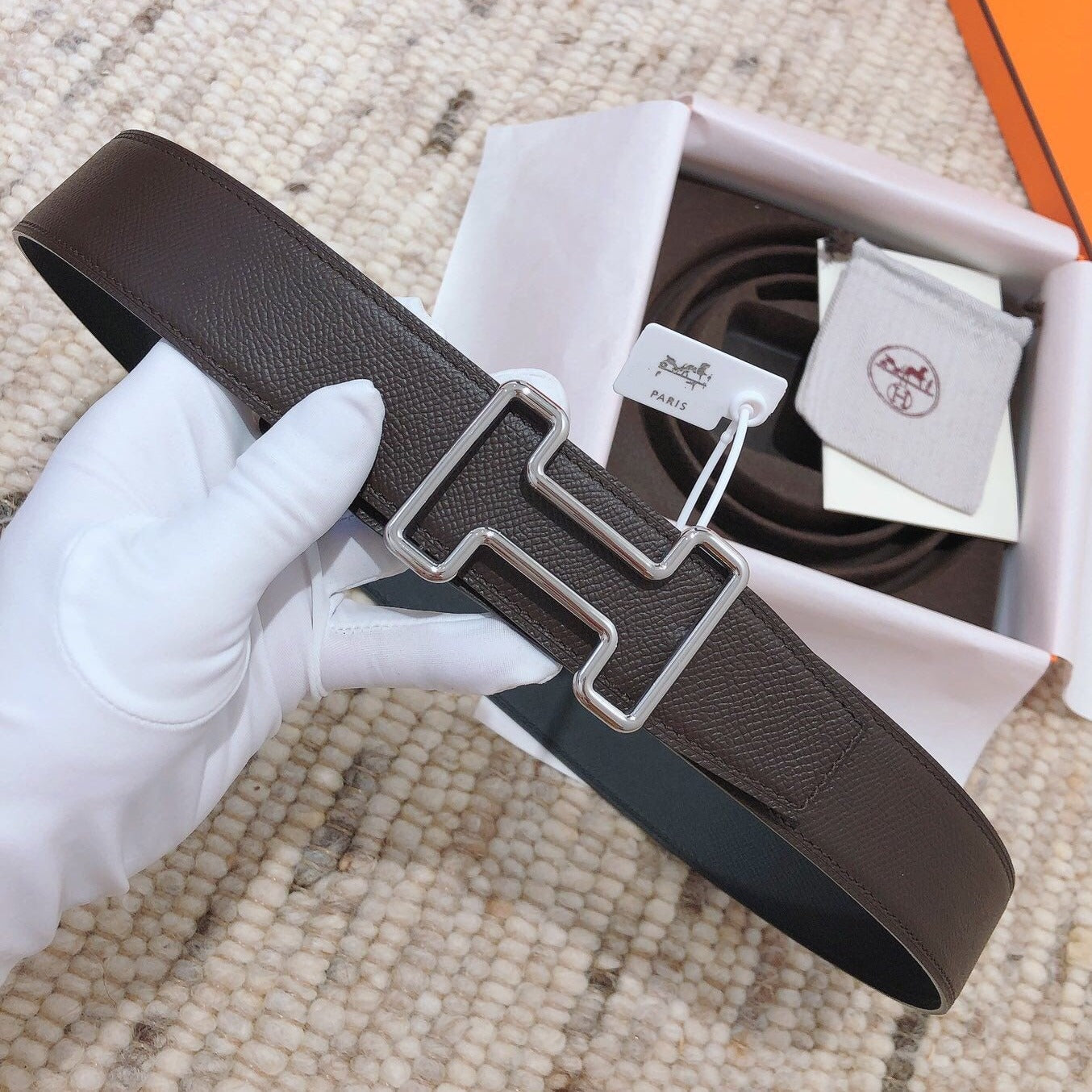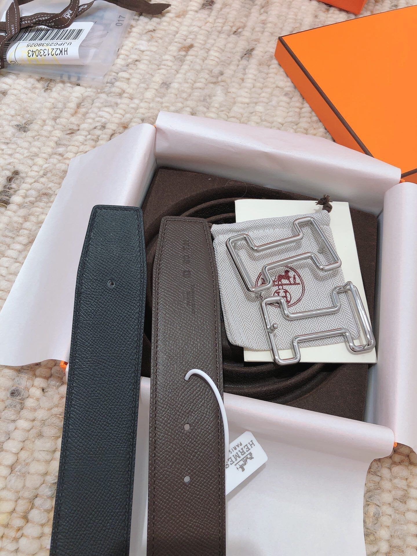 • H Buckle in permabrass plated metal.