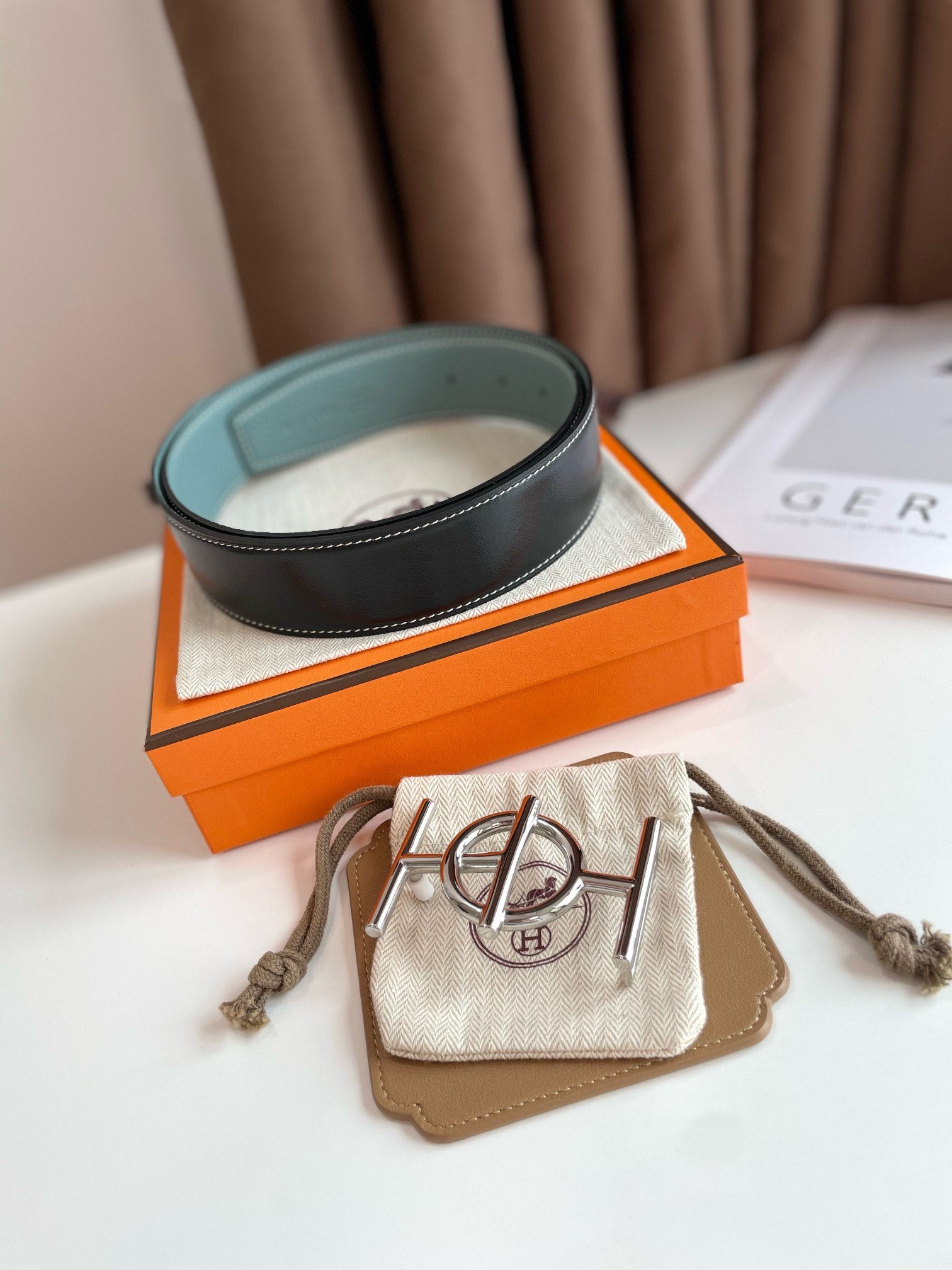 • H Buckle in permabrass plated metal.