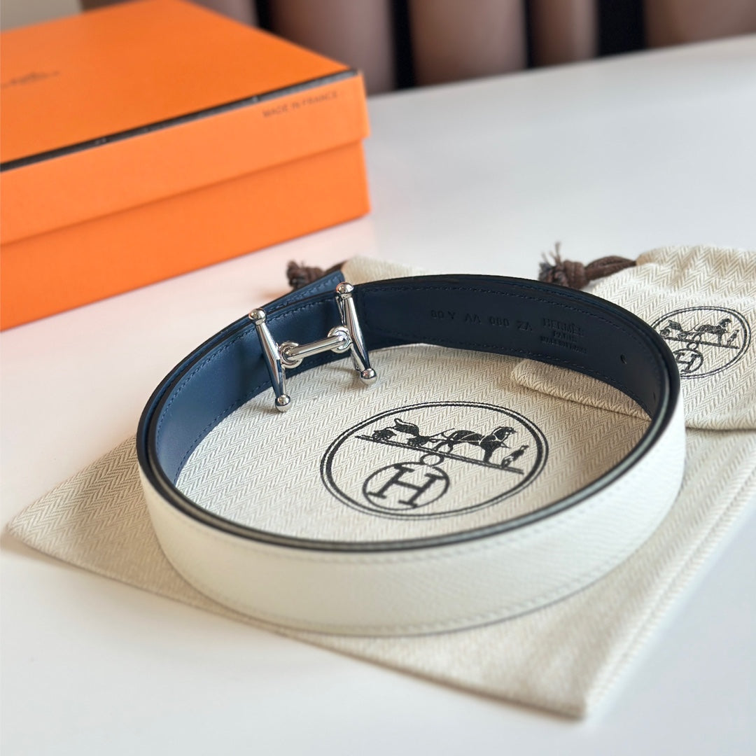 HM Silver Mors H buckle & Reversible 24 mm belt Blue Beige leather 125369