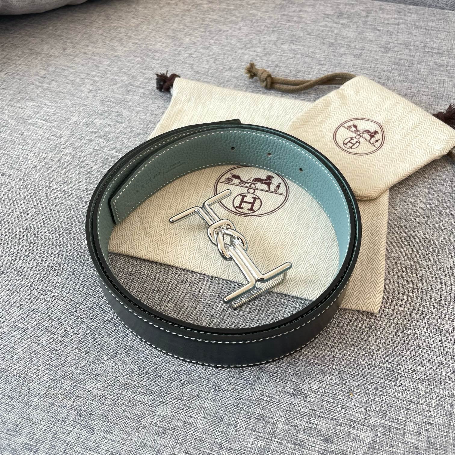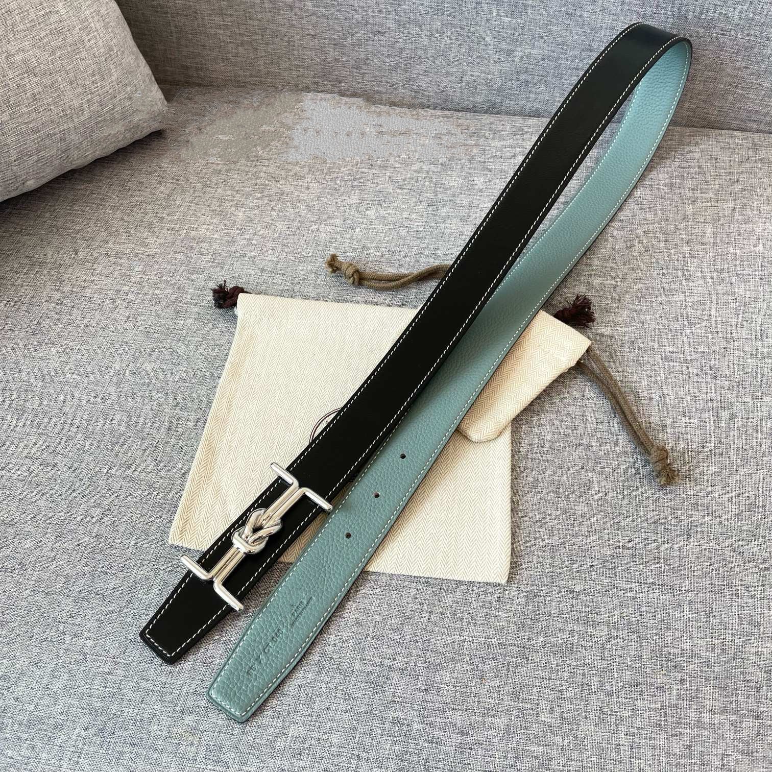 H BELT SILVER BUCKLE GREY BLACK LEATHER REVERSIBLE 3.2CM