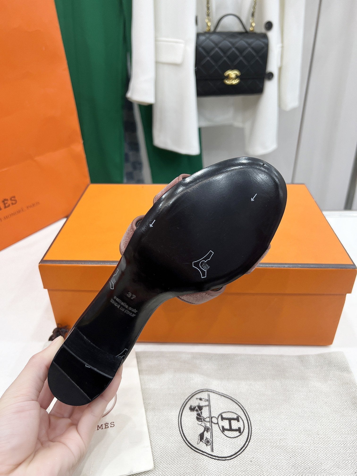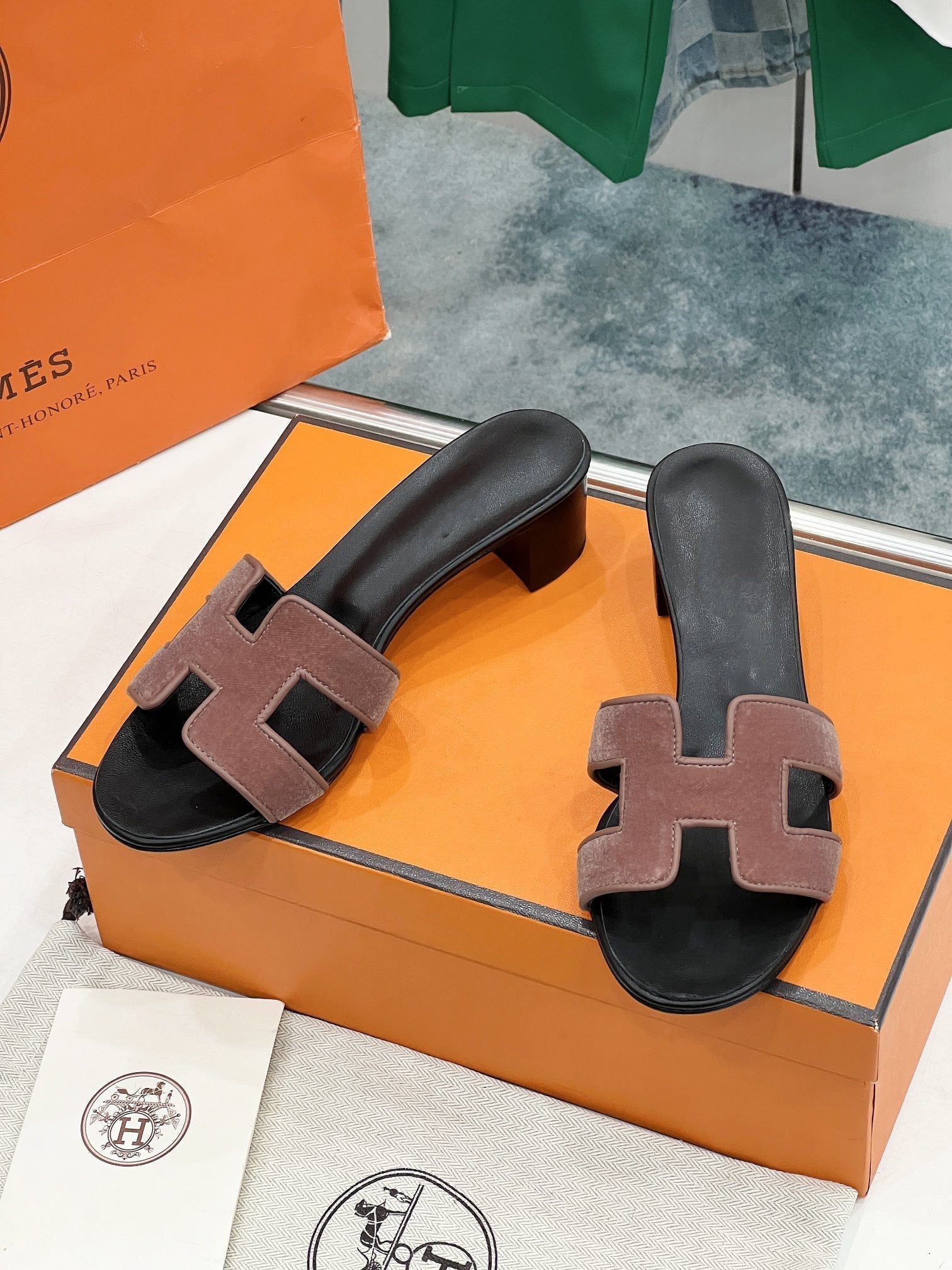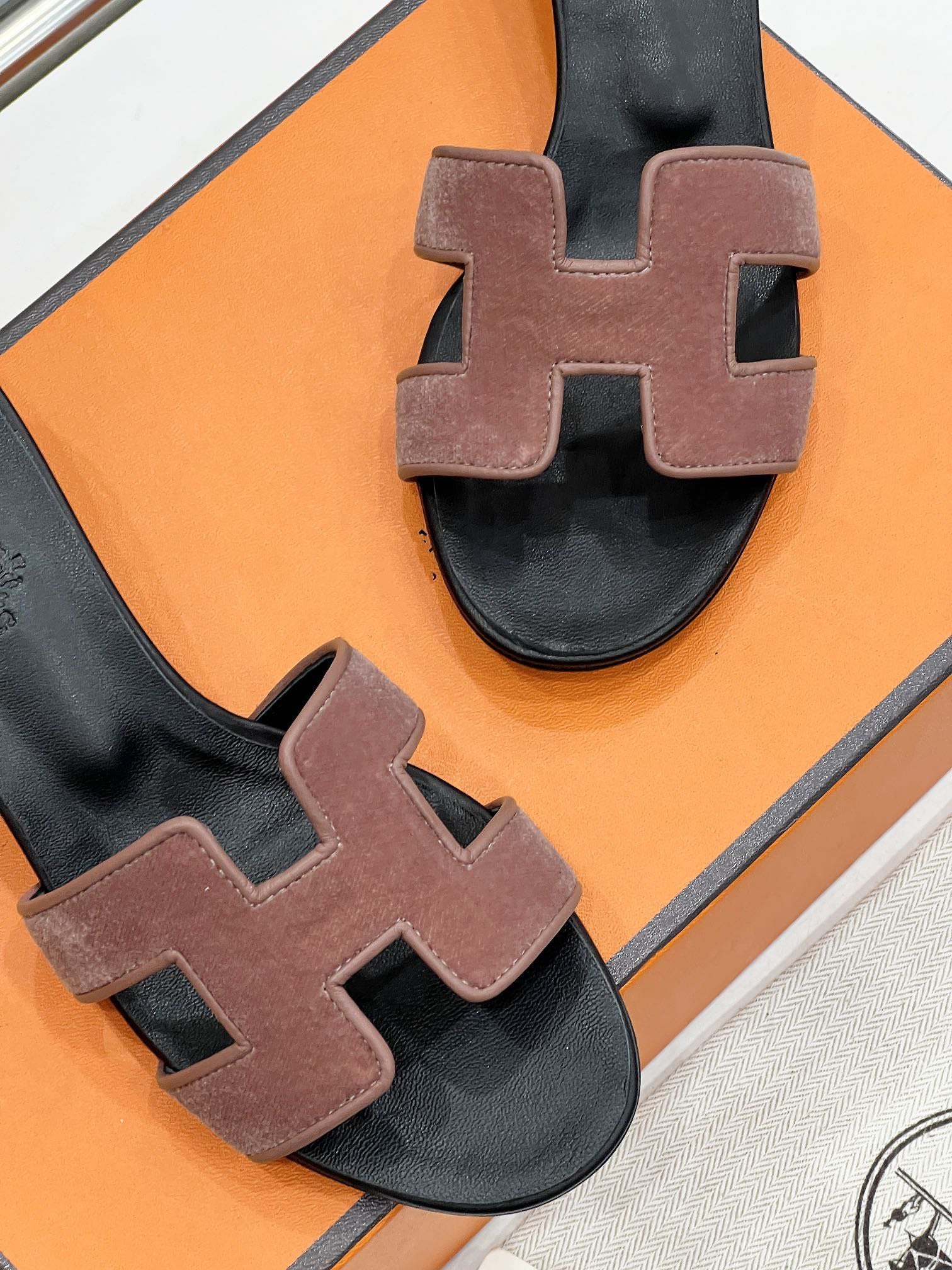 - Material: Sandal in velvet with iconic "H" cut-out.