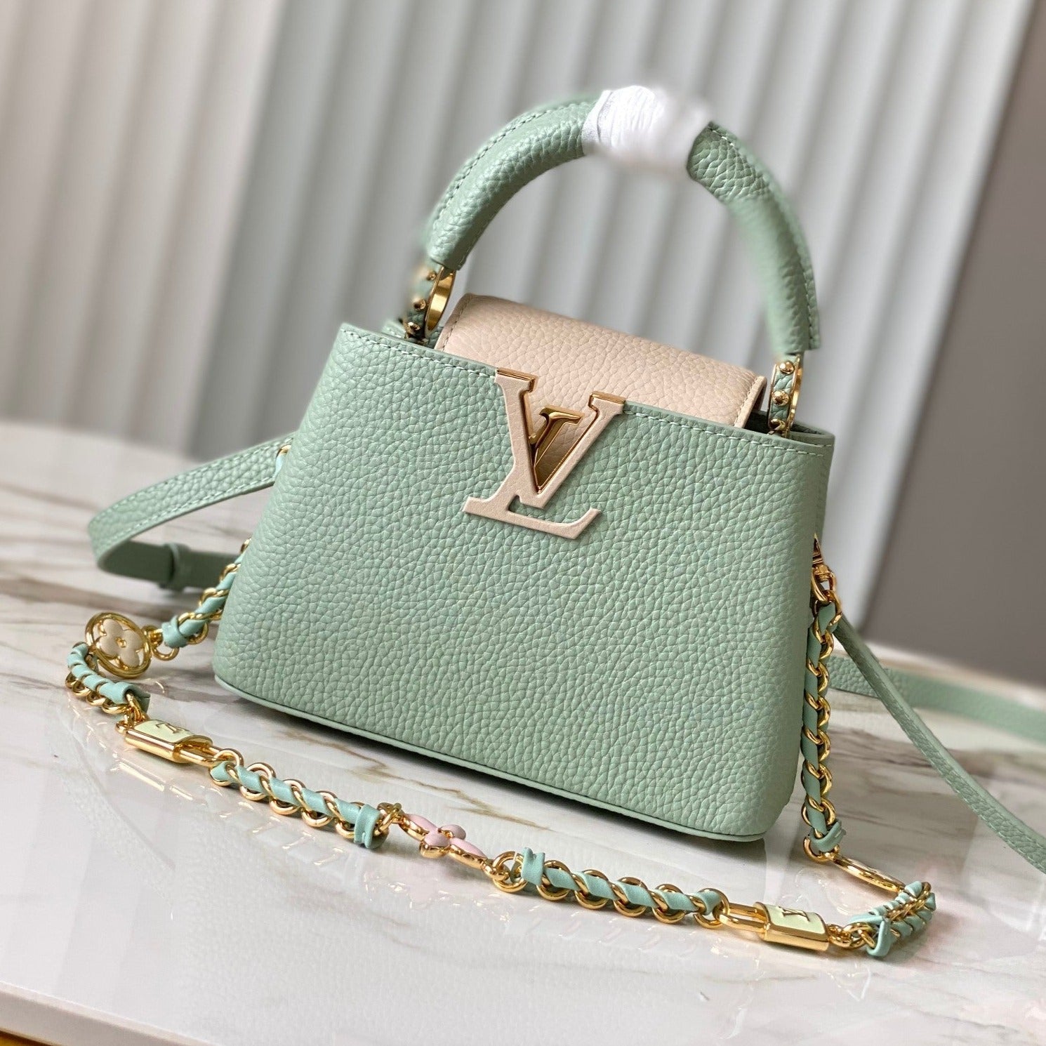 capucines mm 31.5 green beige taurillon leather gold hardware