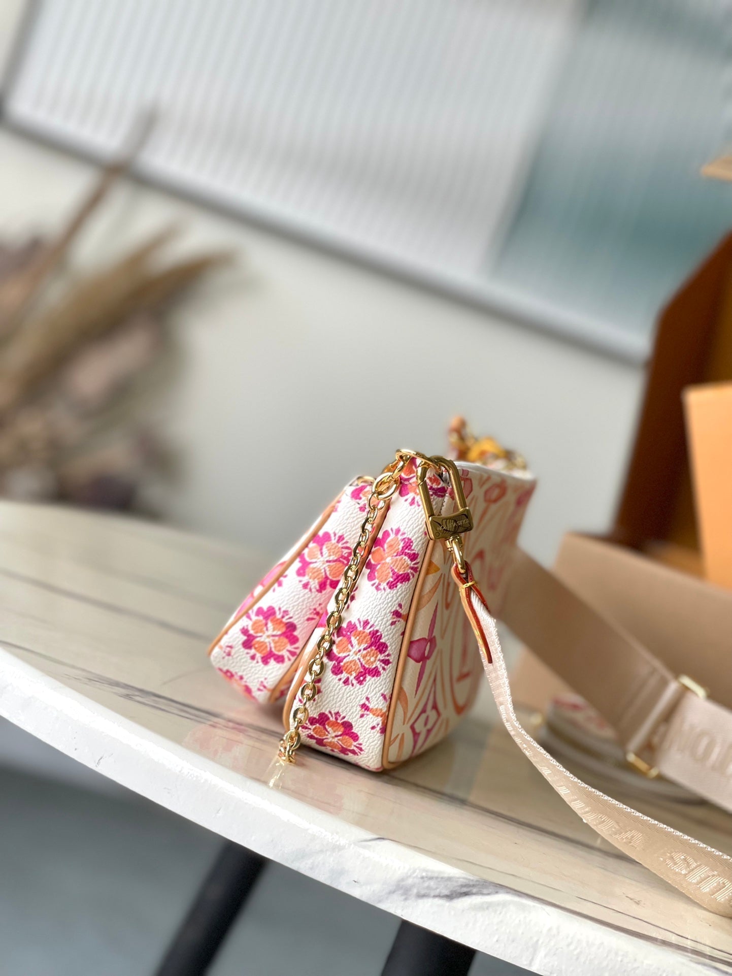 MULTI POCHETTE ACCESSOIRES 24 IN CORAL MONOGRAM TILES CANVAS GOLD HARDWARE