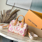 SPEEDY BANDOULIÈRE 20 IN CORAL MONOGRAM TILES CANVAS GOLD BUCKLE