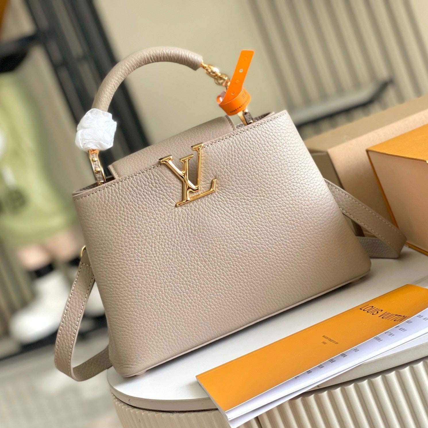 capucines mm 31.5 rock grey taurillon leather gold hardware