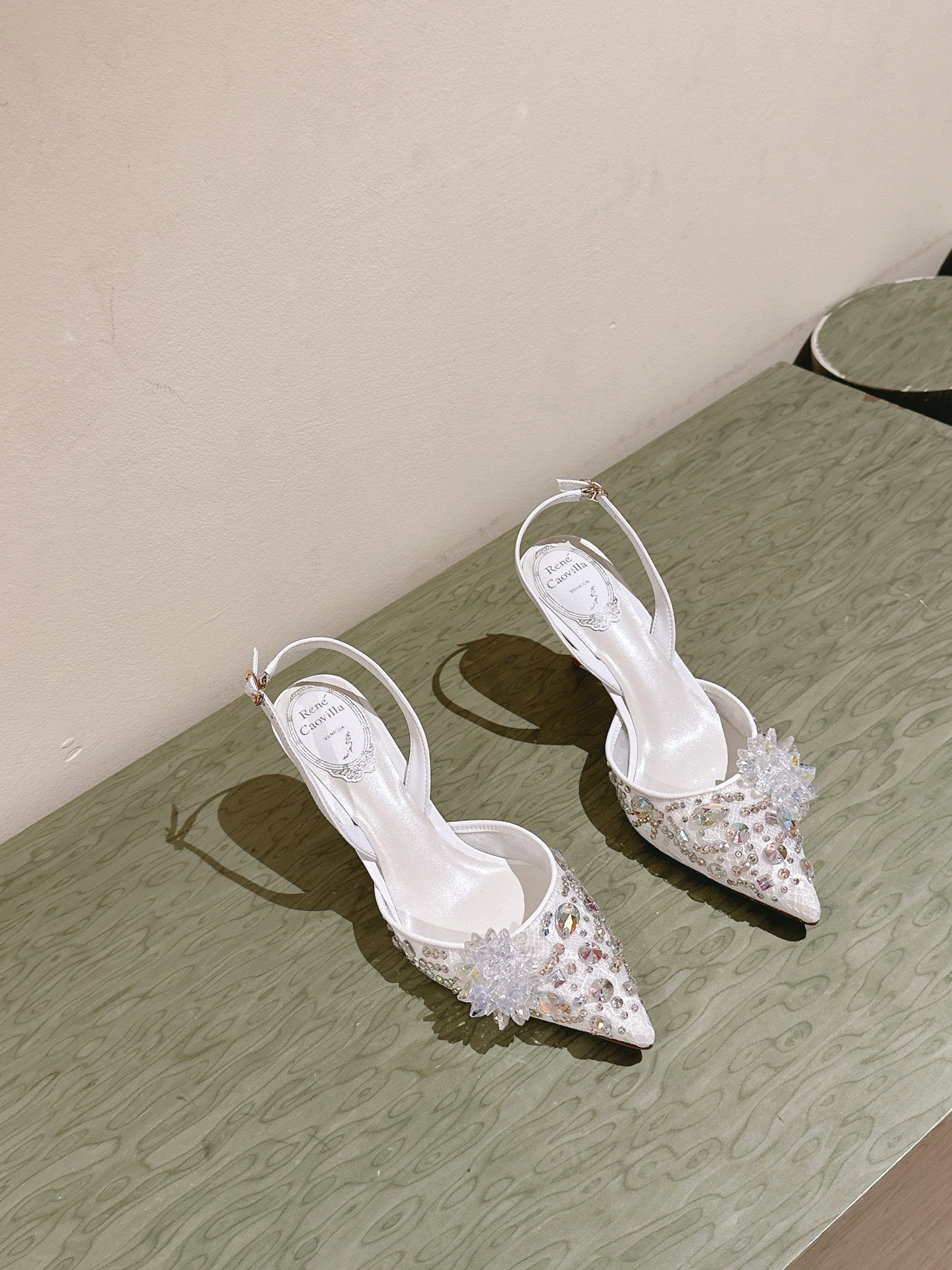 RC 25C Slingback Lace Mesh High Heel 7.5cm White Silk Rhinestones 268082