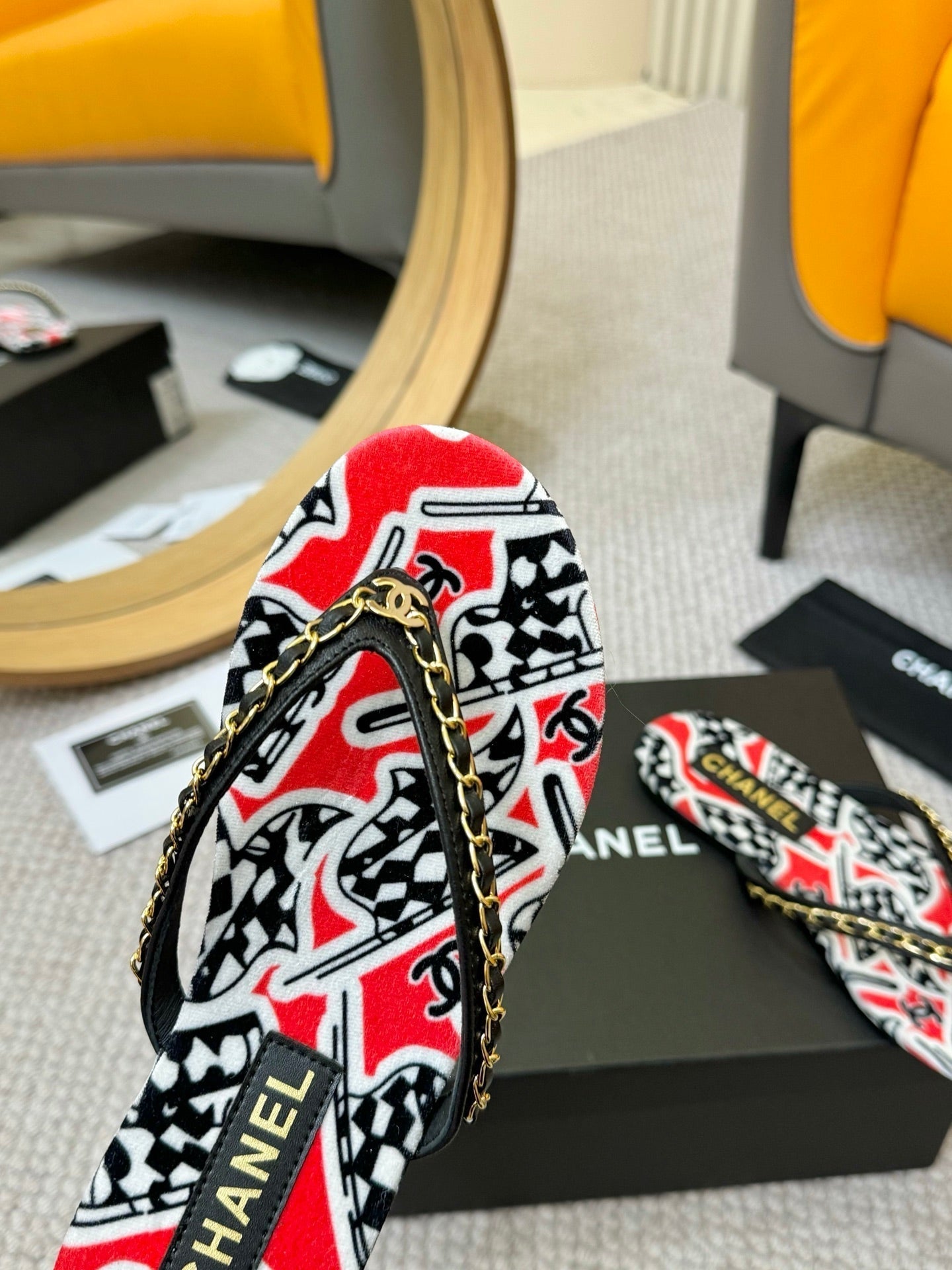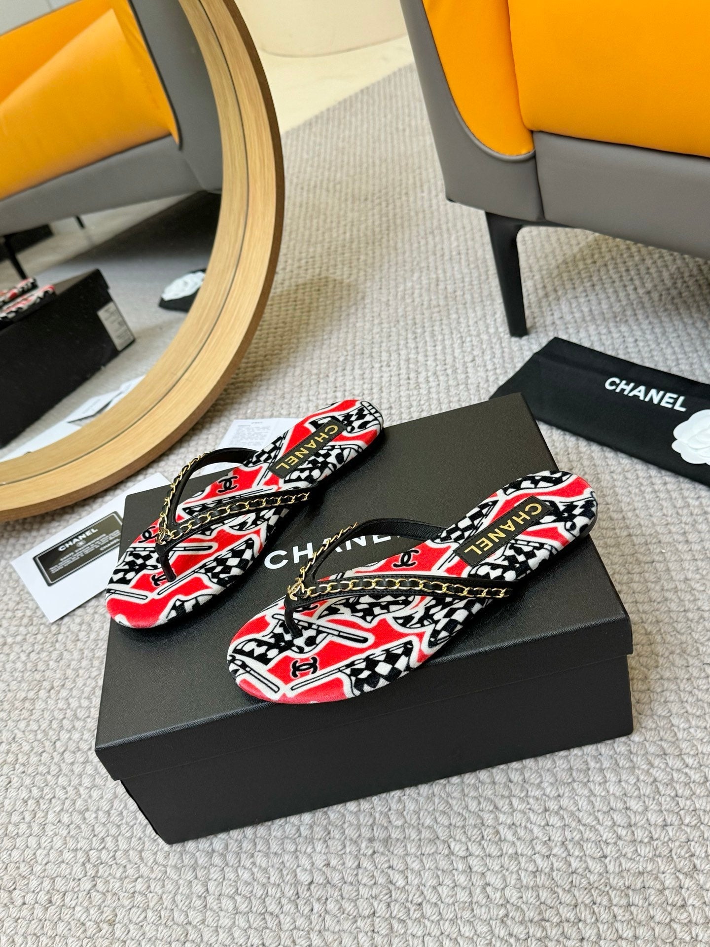 CC Chain Strap Thong Slippers Red Cloth Sheepskin Velvet 305868