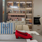 TRIANGLE LOGO PUMPS IN RED SATIN