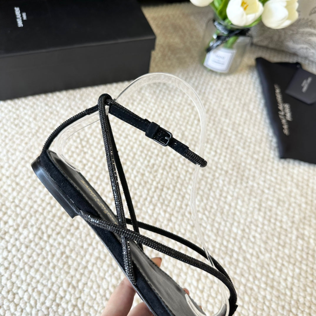 SL CRYSTAL FLAT SANDALS BLACK SUEDE