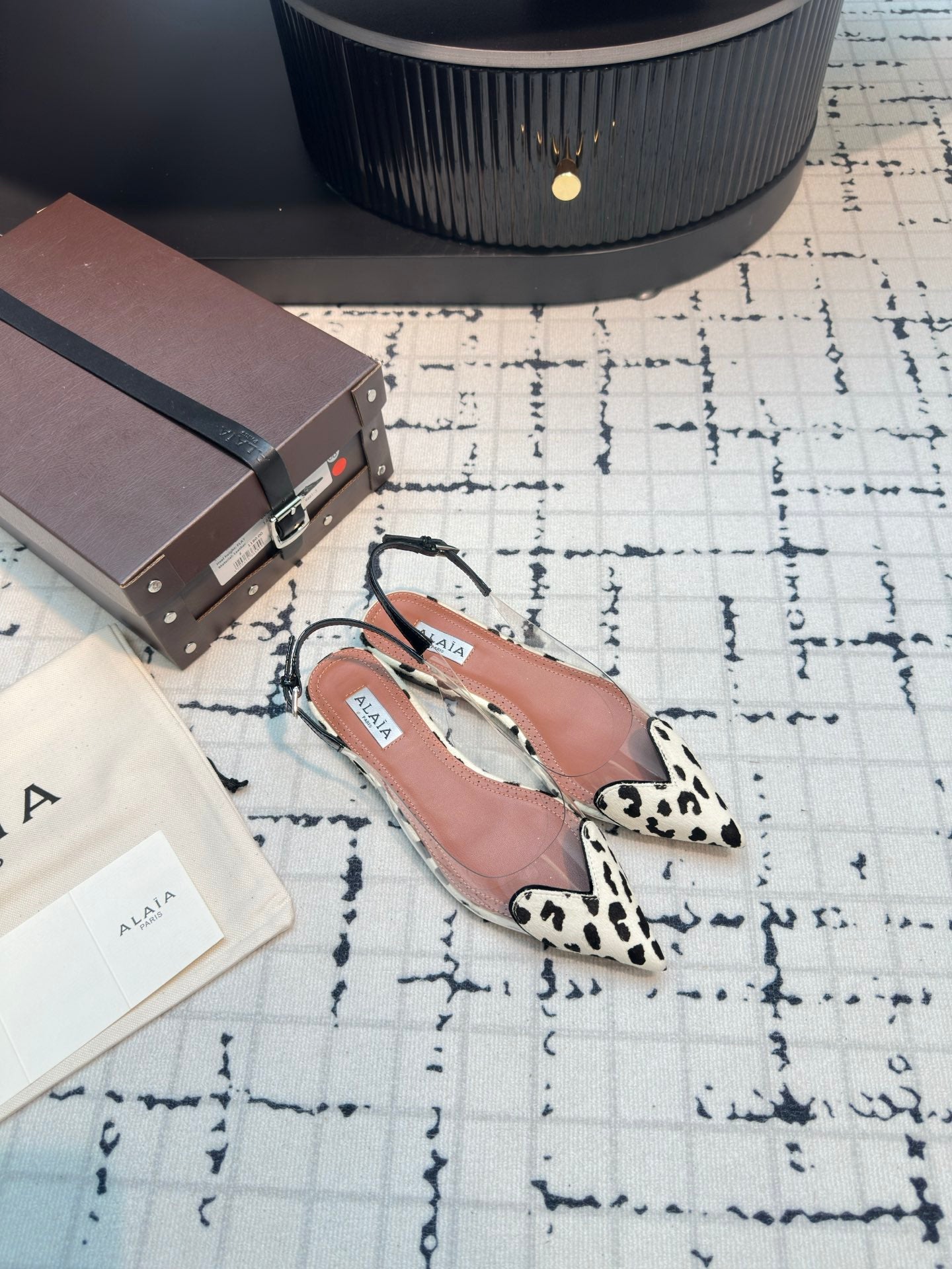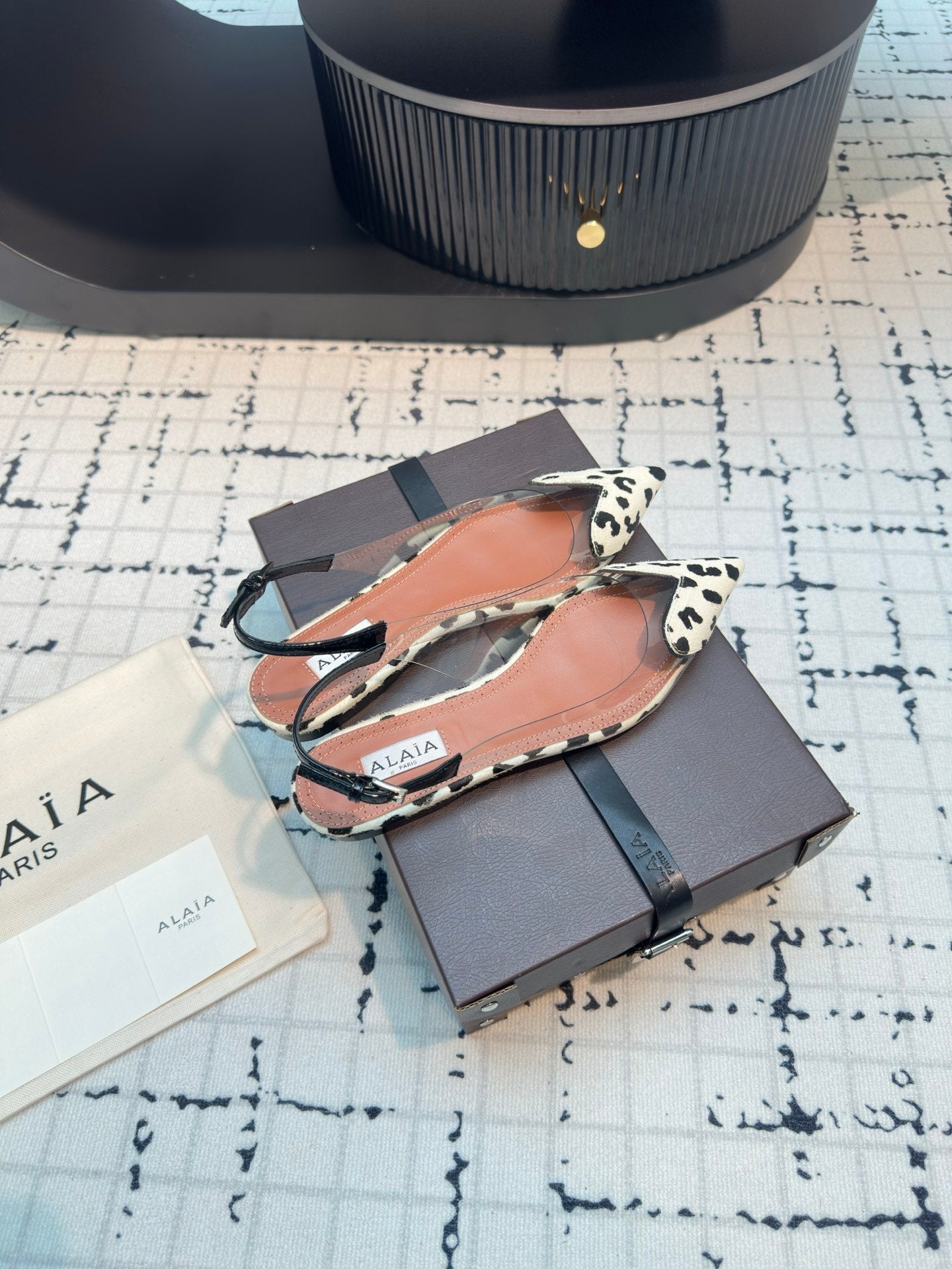 ALAIA FLAT SLINGBACK IN BLACK MIX WHITE PATENT CALFSKIN AND FILM