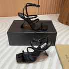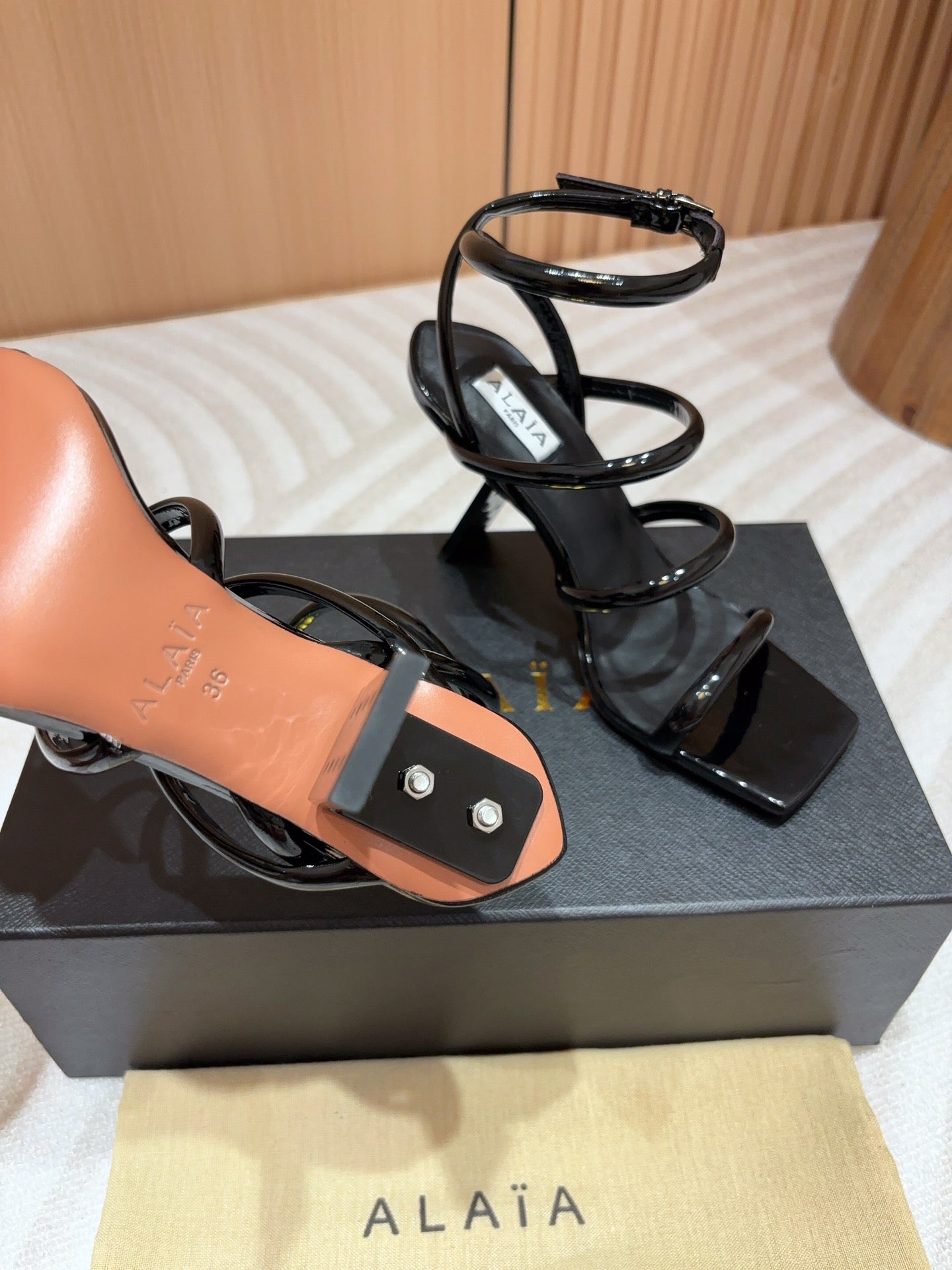 ALAIA THREE-STRAPS HIGH HEEL SANDALS IN BLACK PATENT LAMBSKIN