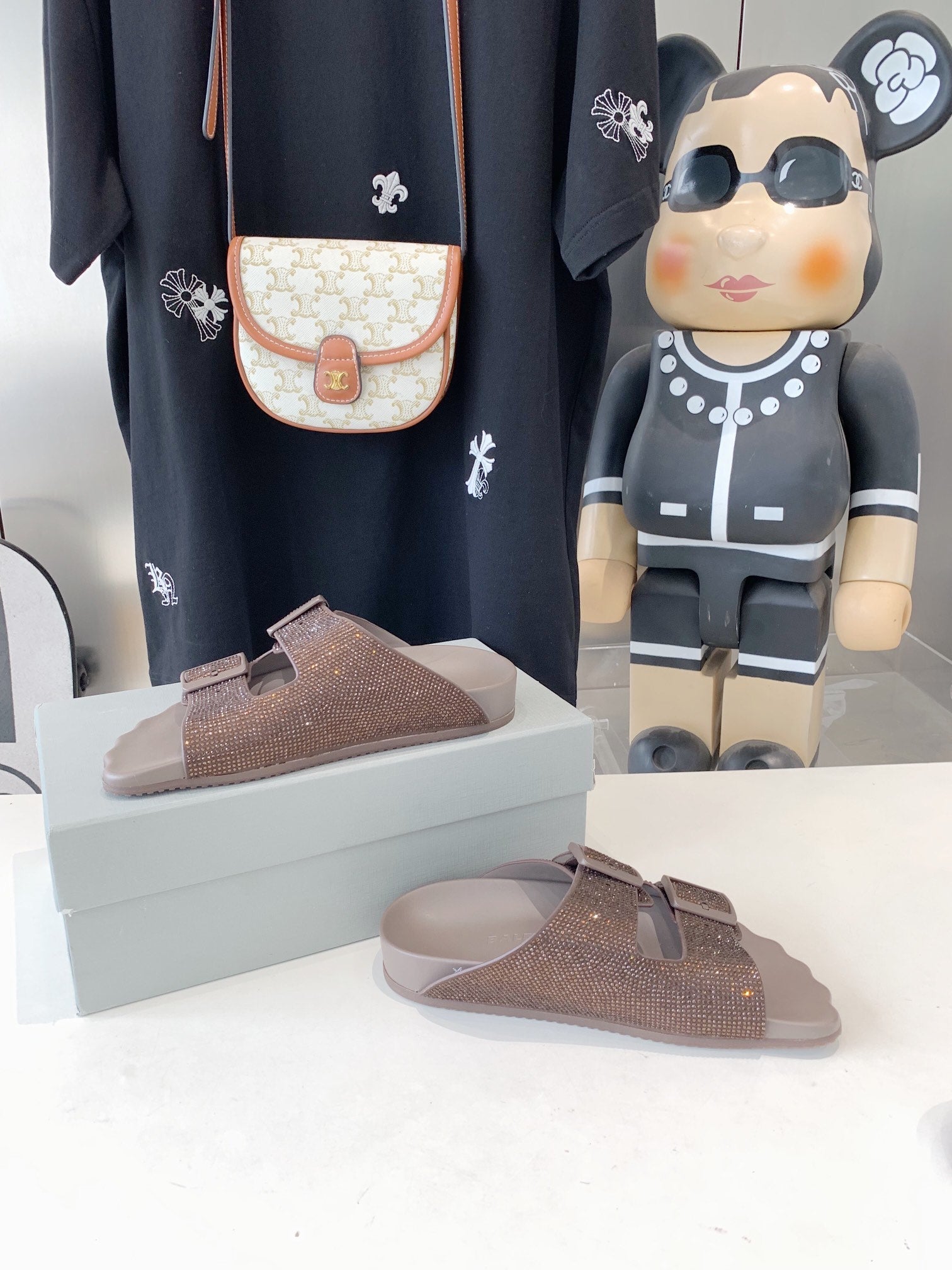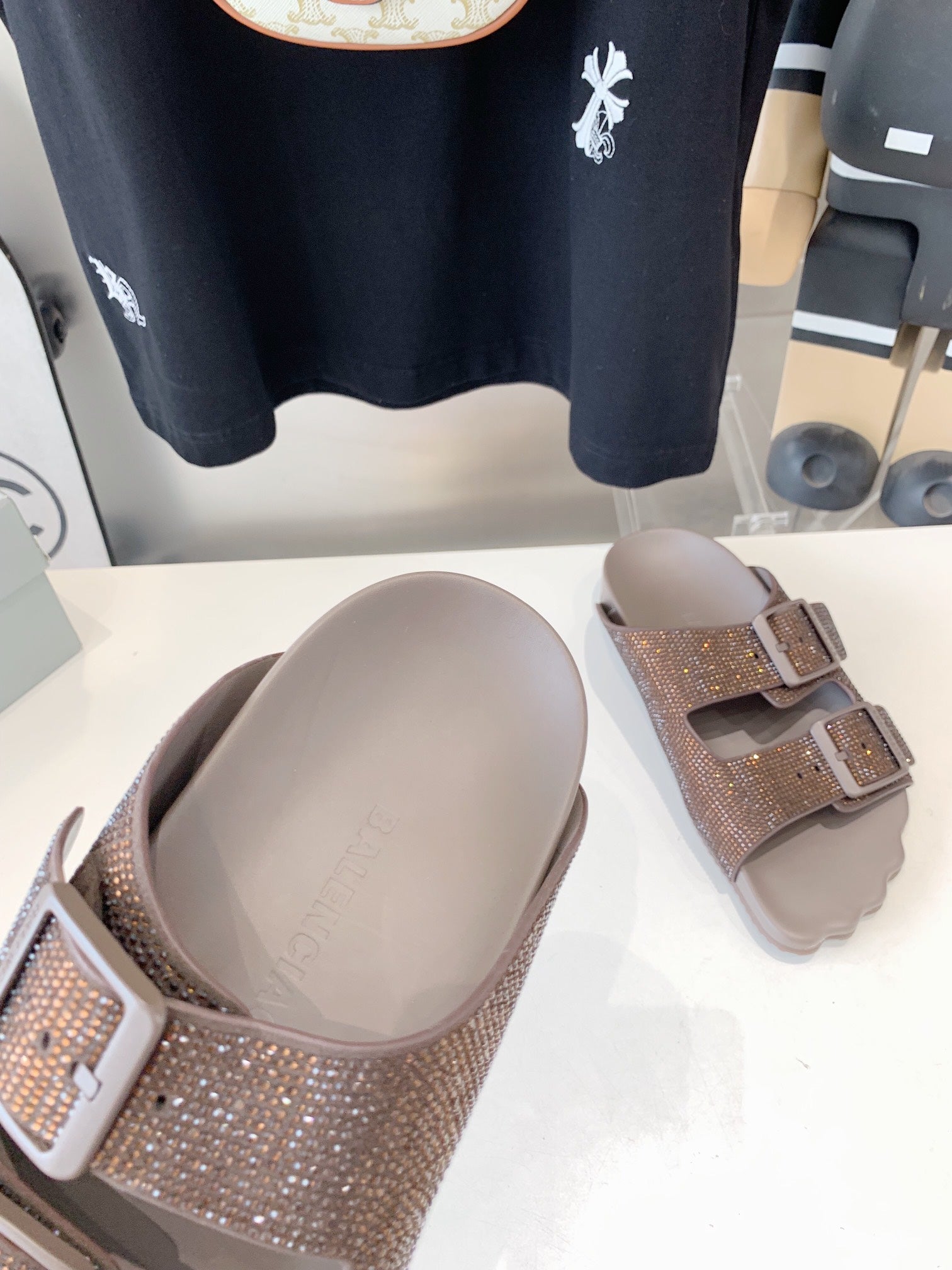BIRKENSTOCK SLIPPERS ATTACHED RHINESTONES IN BROWN CALFSKIN
