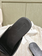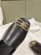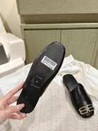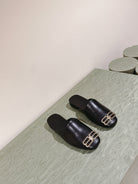 BLACK SHINY LAMBSKIN SQUARE TOE FLAT MULES GOLD BUCKLE