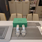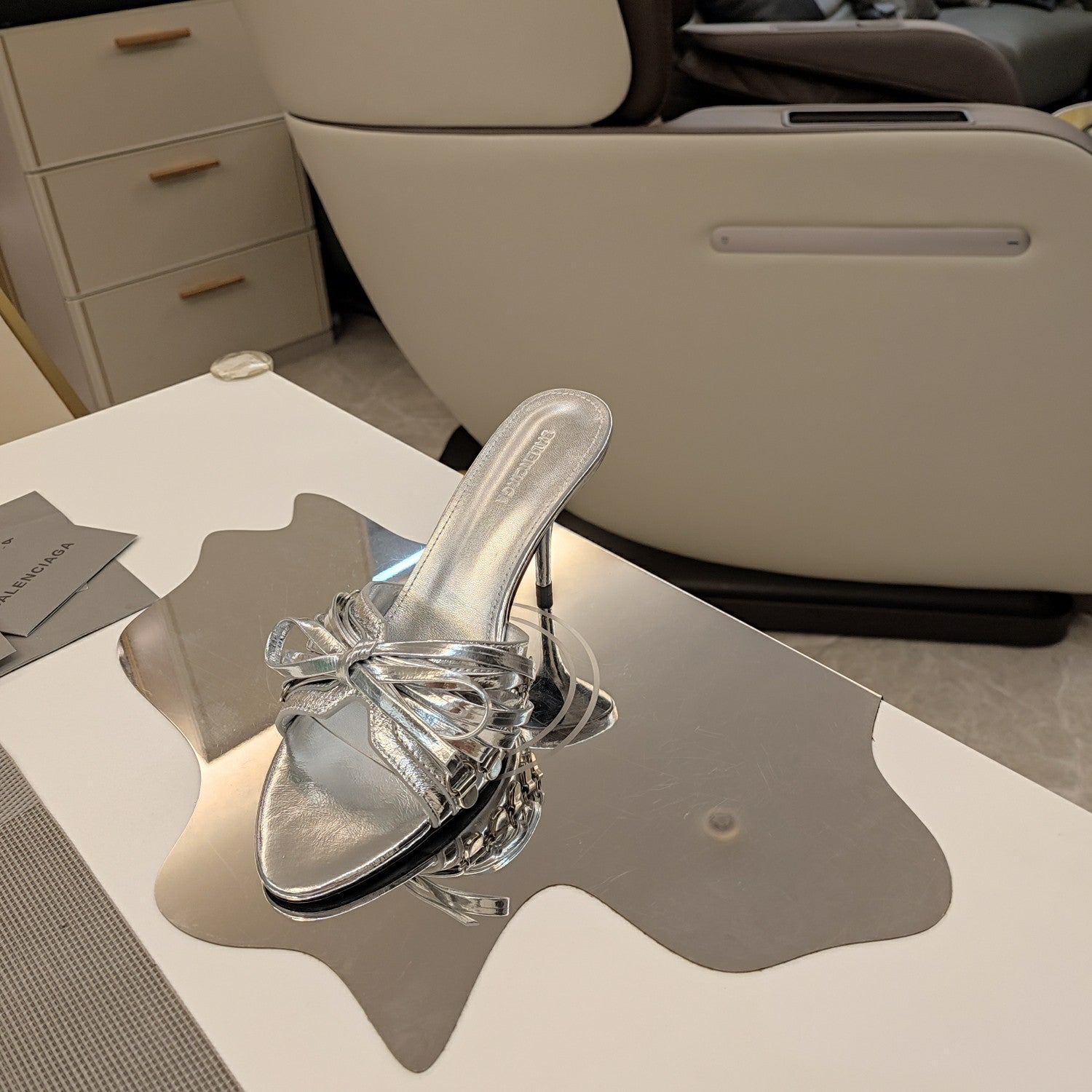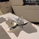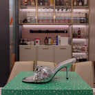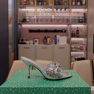 BOW-EMBELLISHED HIGH MULES IN SILVER METALLIC SHEEPSKIN