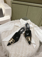 POINTED BB GOLD BUCKLE HIGH MULES IN BLACK SILK