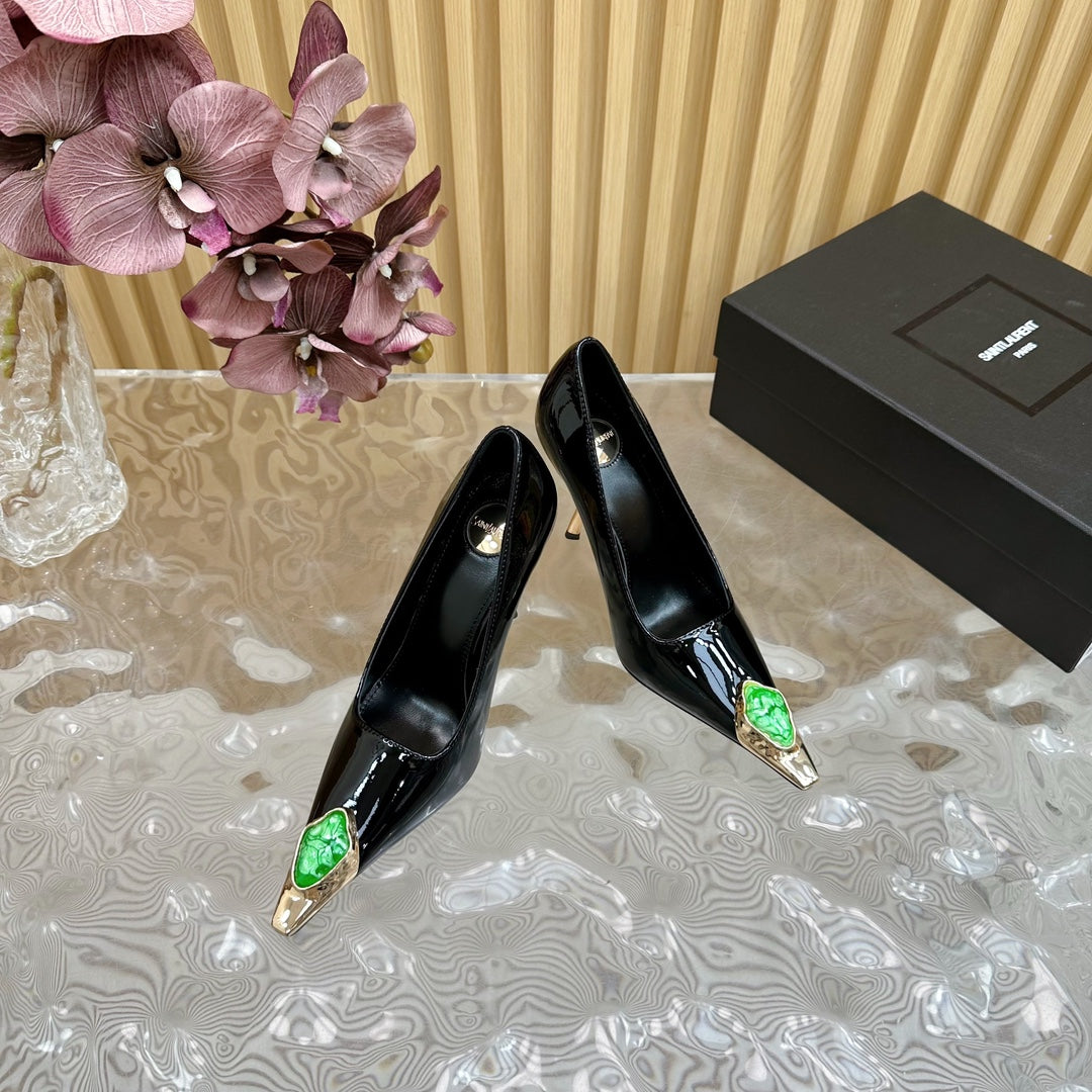 GREEN GEM-STUDDED HIGH PUMPS IN BLACK PATENT CALFSKIN
