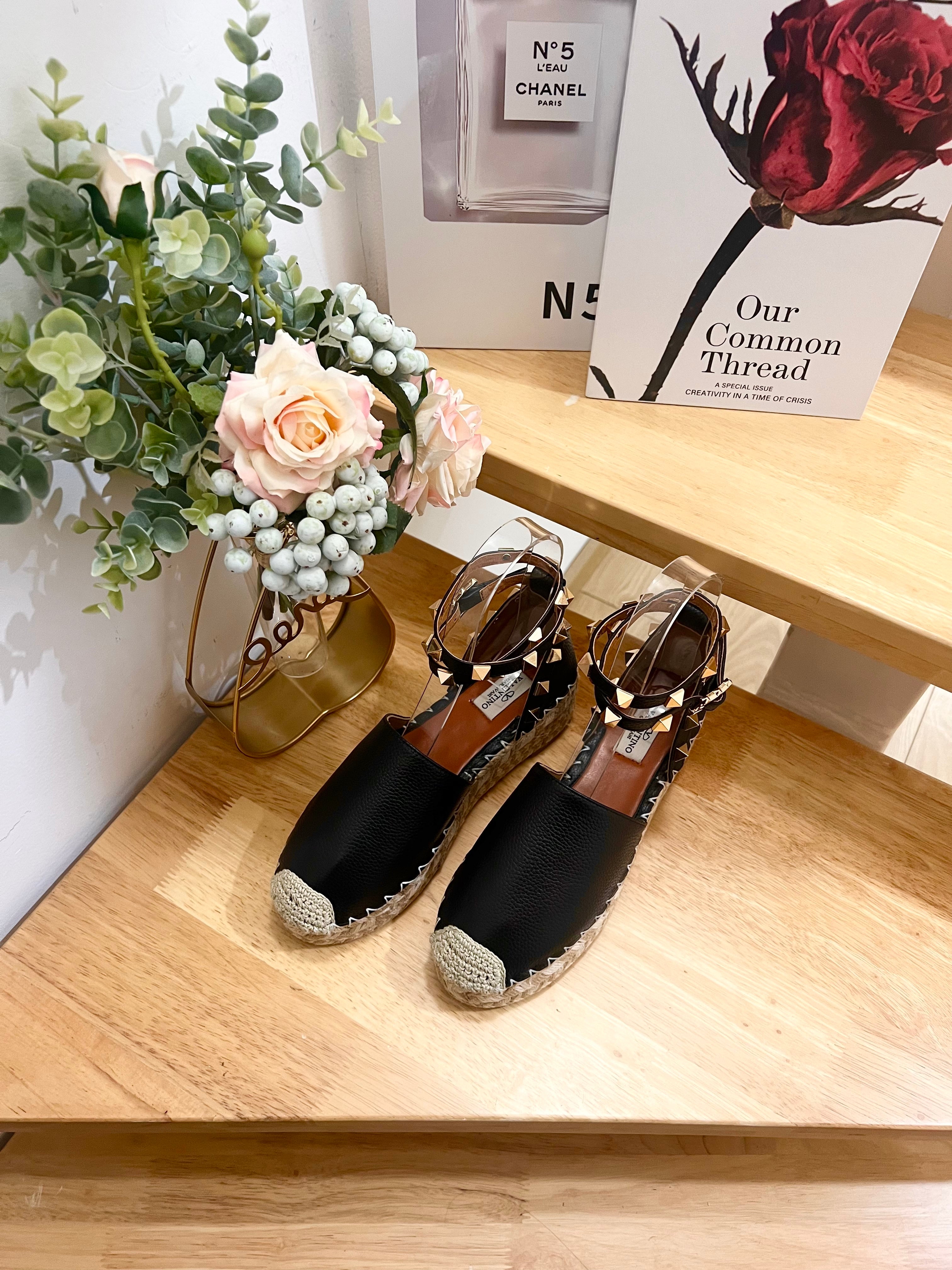 Valentino Rockstud Espadrille Sandals Black Leather 240596