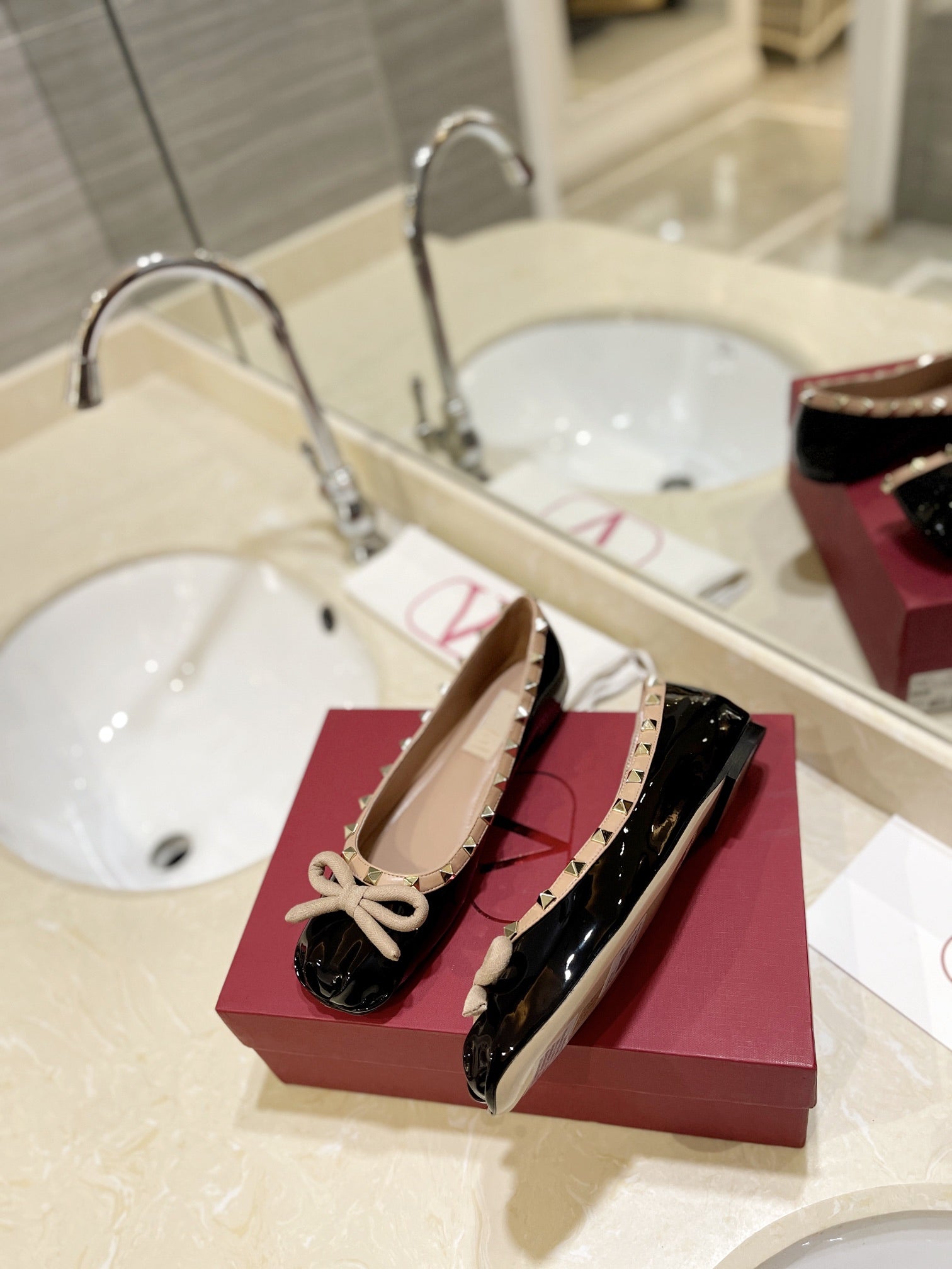 ROCKSTUD PATENT BLACK BEIGE LEATHER BALLERINA