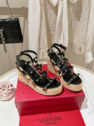 ROCKSTUD ANKLE STRAP WEDGE SANDAL IN BLACK CALFSKIN LEATHER 95 MM