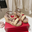 Valentino Garavani Taupe Wedge Rockstud Sandals 10mm In Rosy Brown Calfskin And Beige Raffia 829386