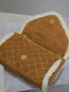 ENVELOPE CHAIN BAG 21 IN BRONZE BROWN SUEDE AND WHITE SHEARLING TRIM GOLD HARDWARE