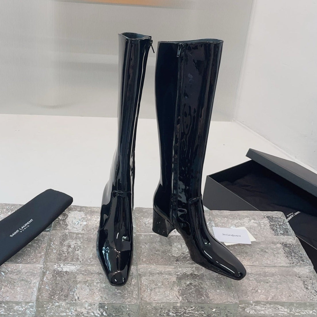 YSL 25 High Heeled Long Boot Black Patent Leather 522261