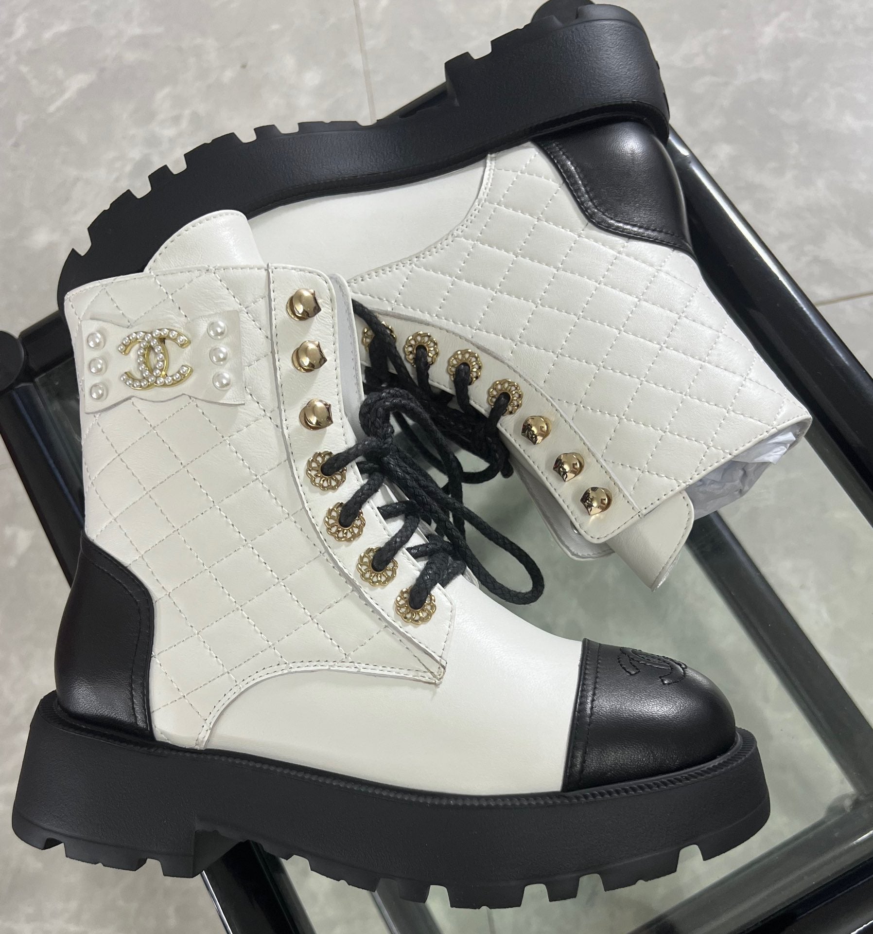 CC Combat Boots White Black Quilted Lambskin 944574