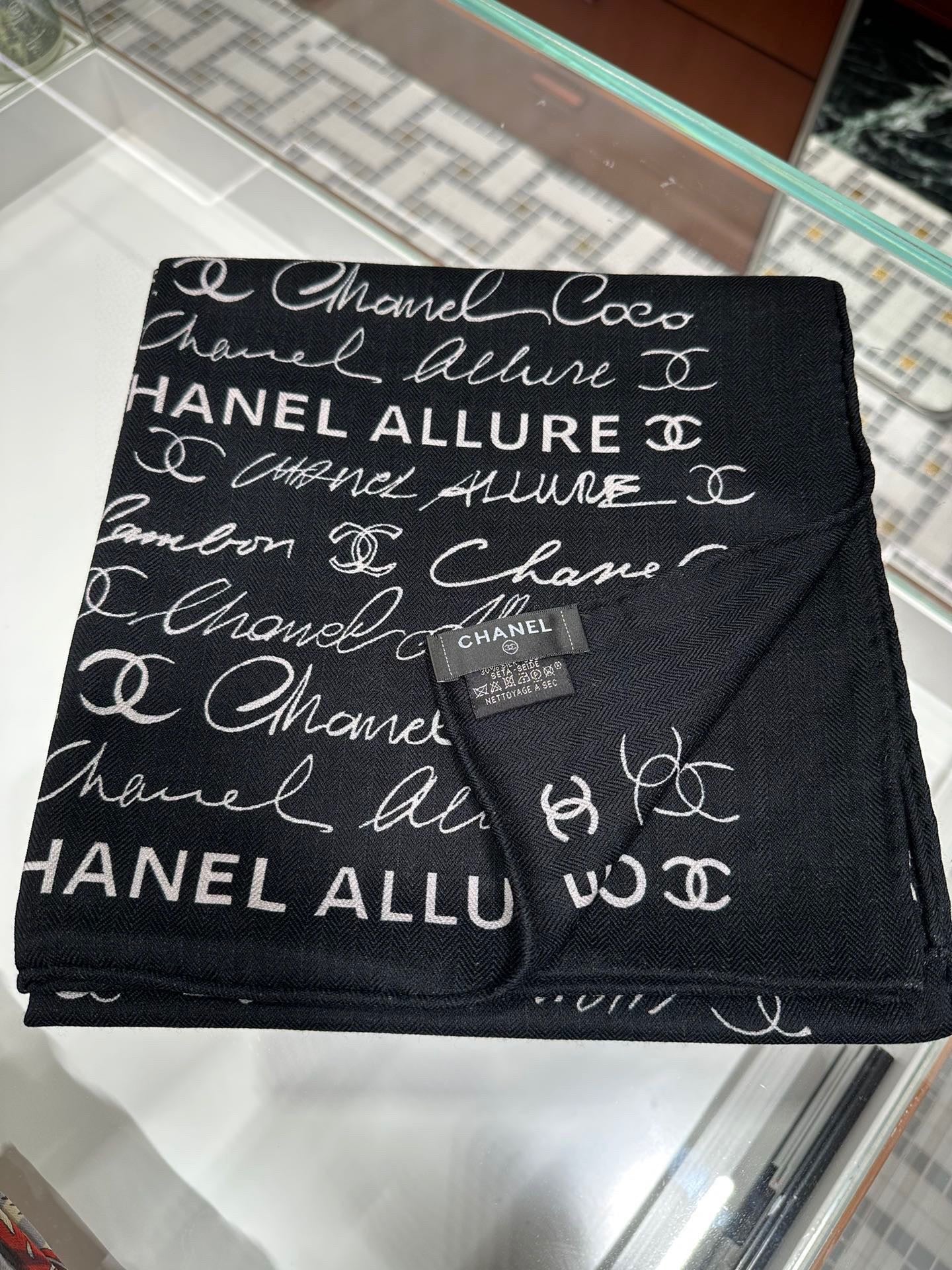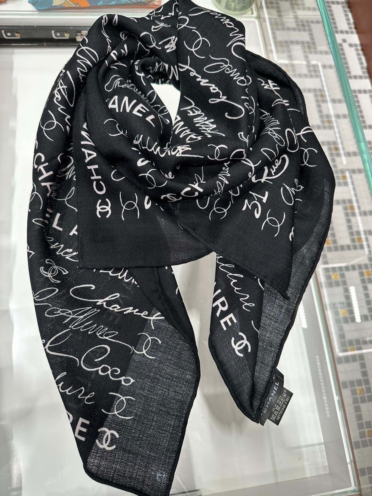 CC Square Scarf 110 CM In Black With White Text Cashmere Silk 320584