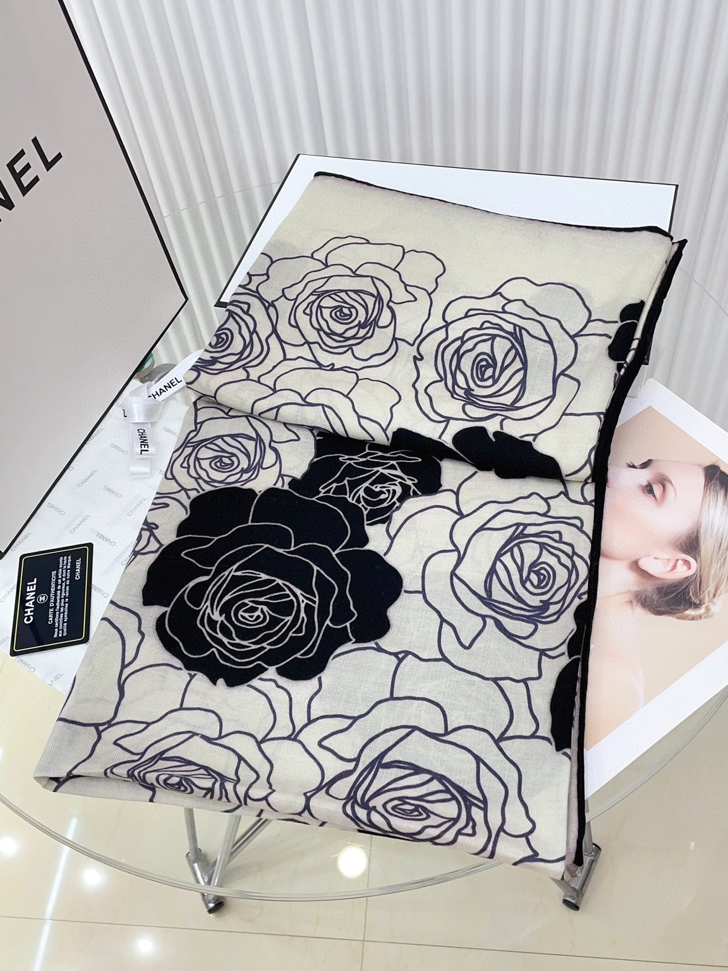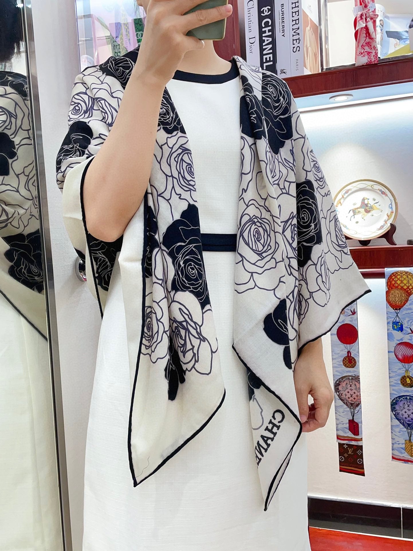 CC Square Scarf 140 CM In White Mix Black Small Flower Cashmere And Silk 342863