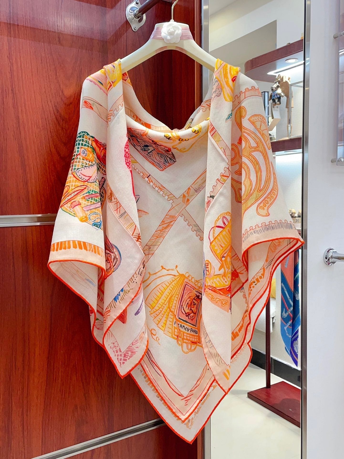 Chevaloscope Scarf 140 CM In Yellow Orange Colorful Cashmere And Silk 373659