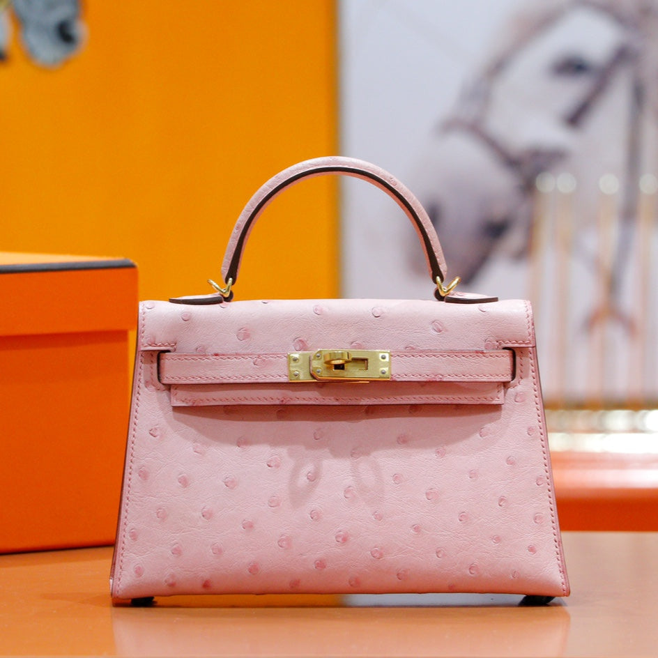 HM Mini Kelly 19cm Pink Ostrich Gold Hardware