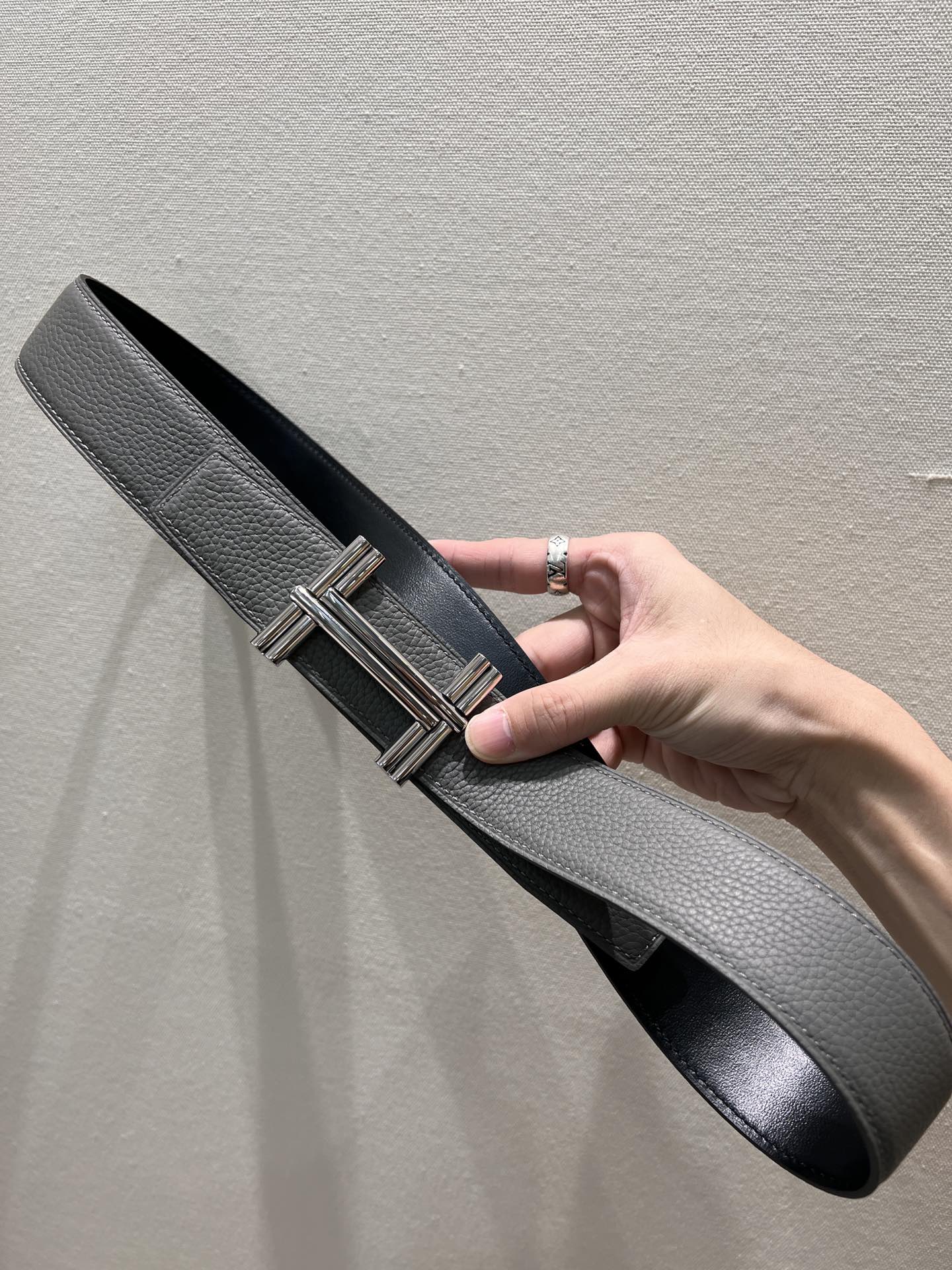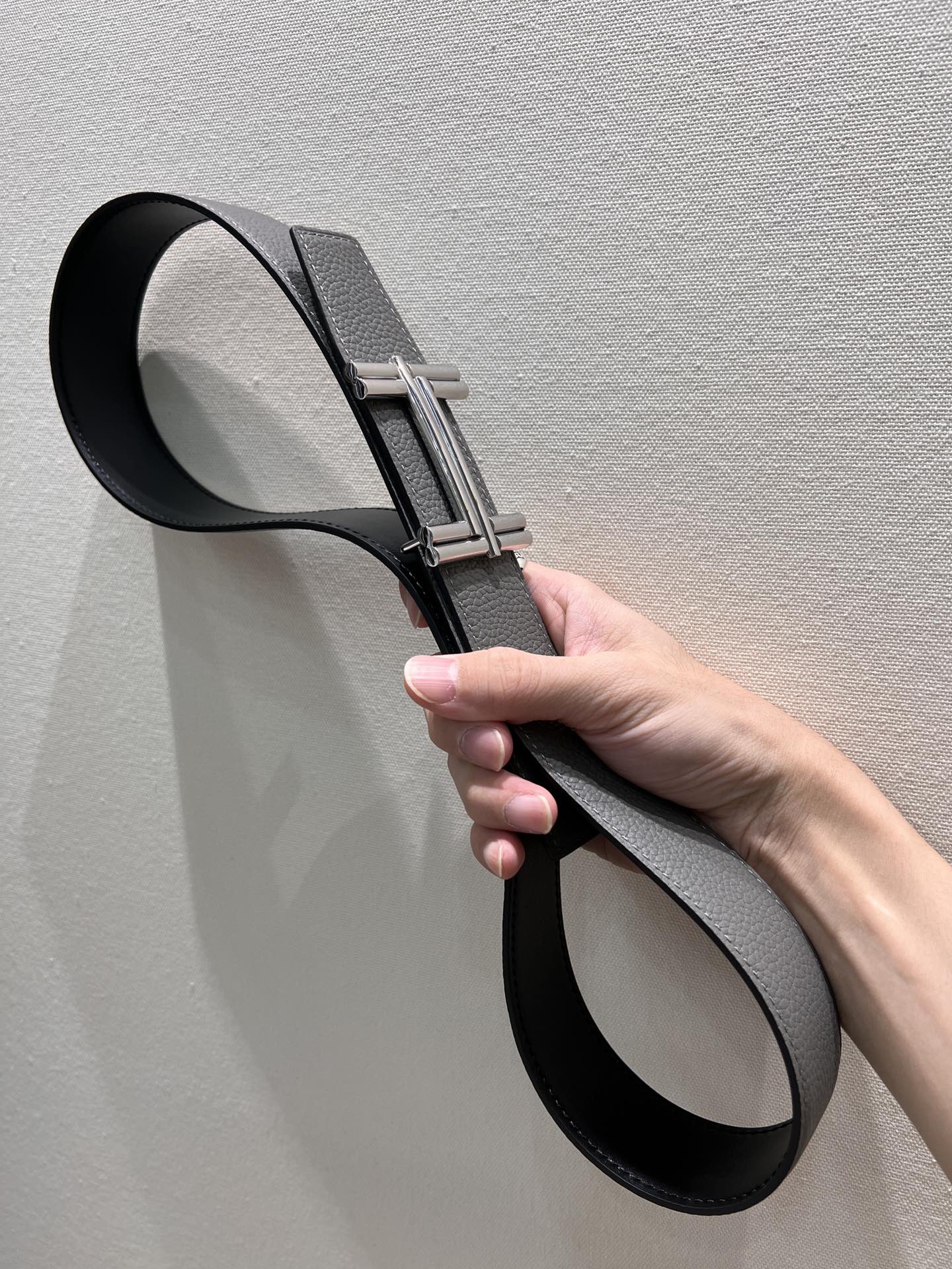HM TRAVERSE BELT BUCKLE & REVERSIBLE GRAY AND BLACK LEATHER STRAP 38 MM SILVER HARDWARE