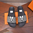 LV SLIPPERS IN BLACK MIX WHITE DAMIER CALFSKIN WITH WHITE LOGO