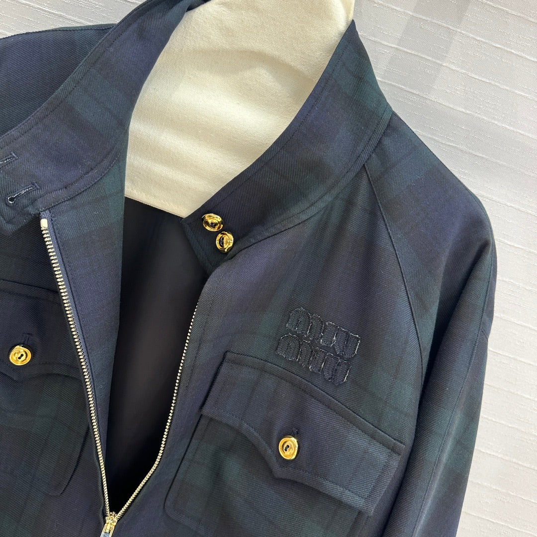 Miu Miu Plaid Drop Shoulder Jacket Green Blue Wool