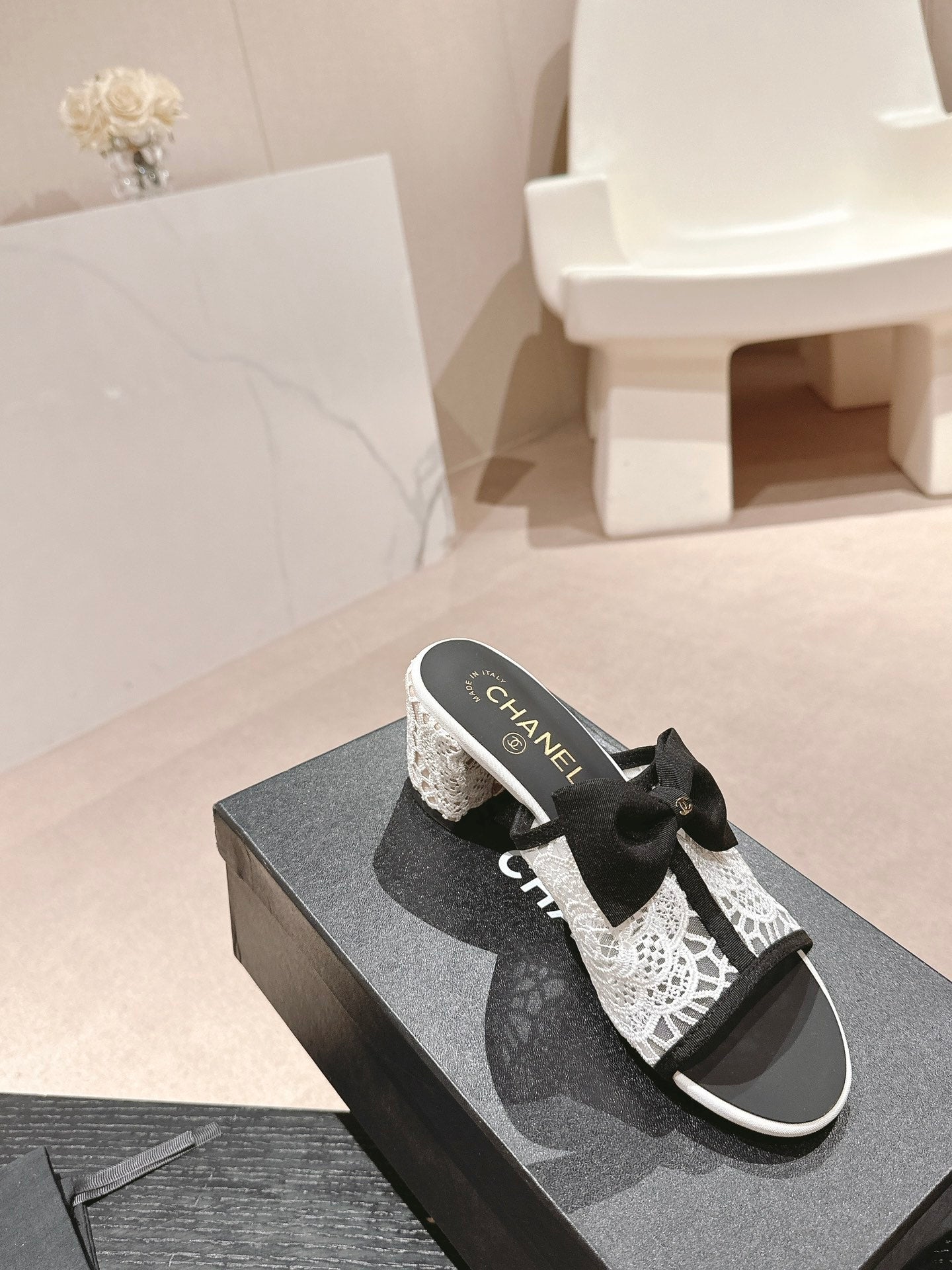 mule sandal 60 bowtie white lacce fabric
