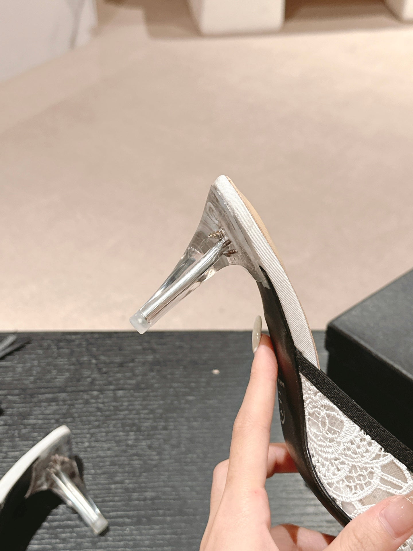 - Material: lace fabric, Calfskin