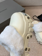 PLATFORM MULES IN BEIGE RUBBER MIX RABBIT FUR SILVER HARDWARE