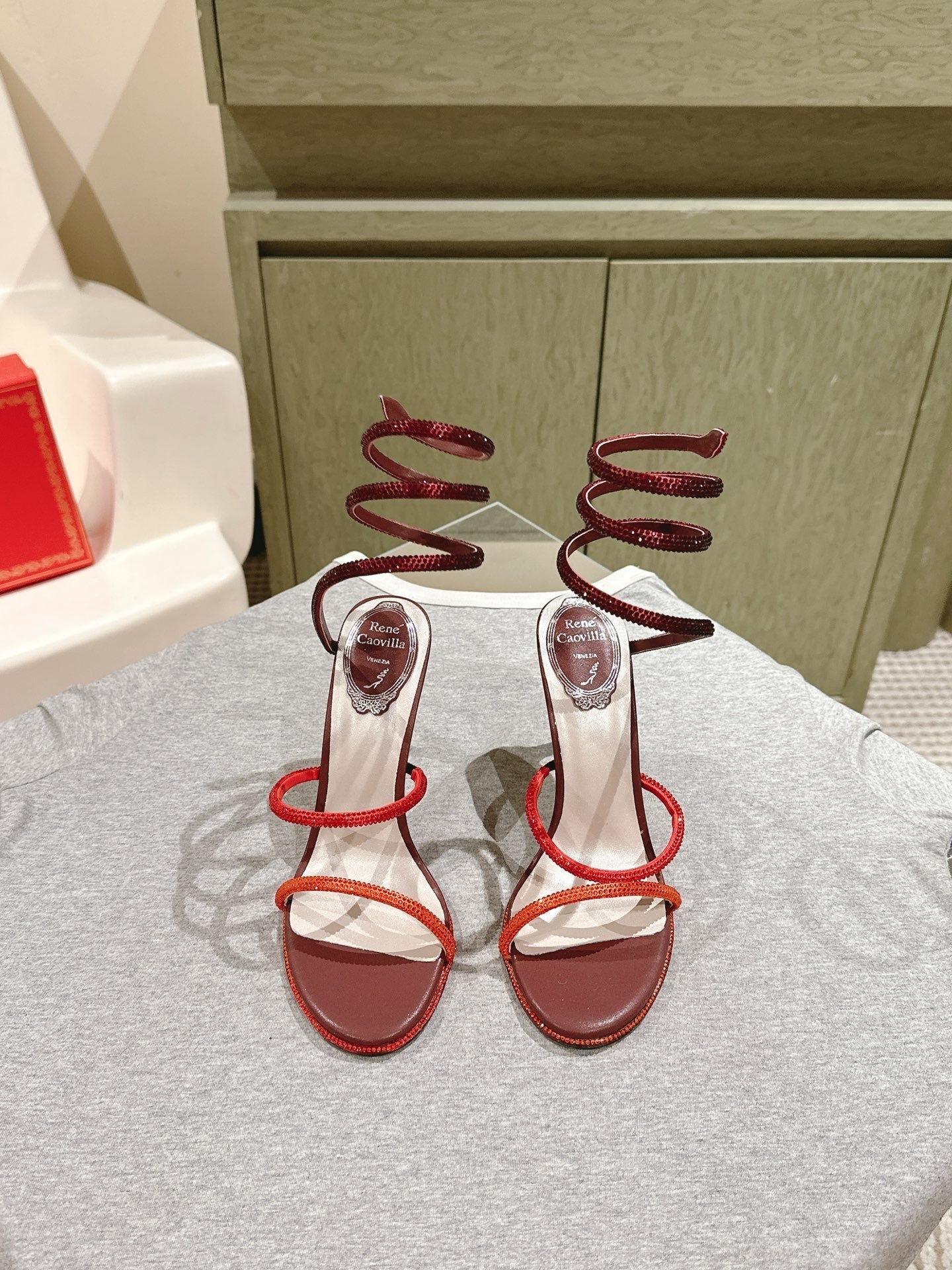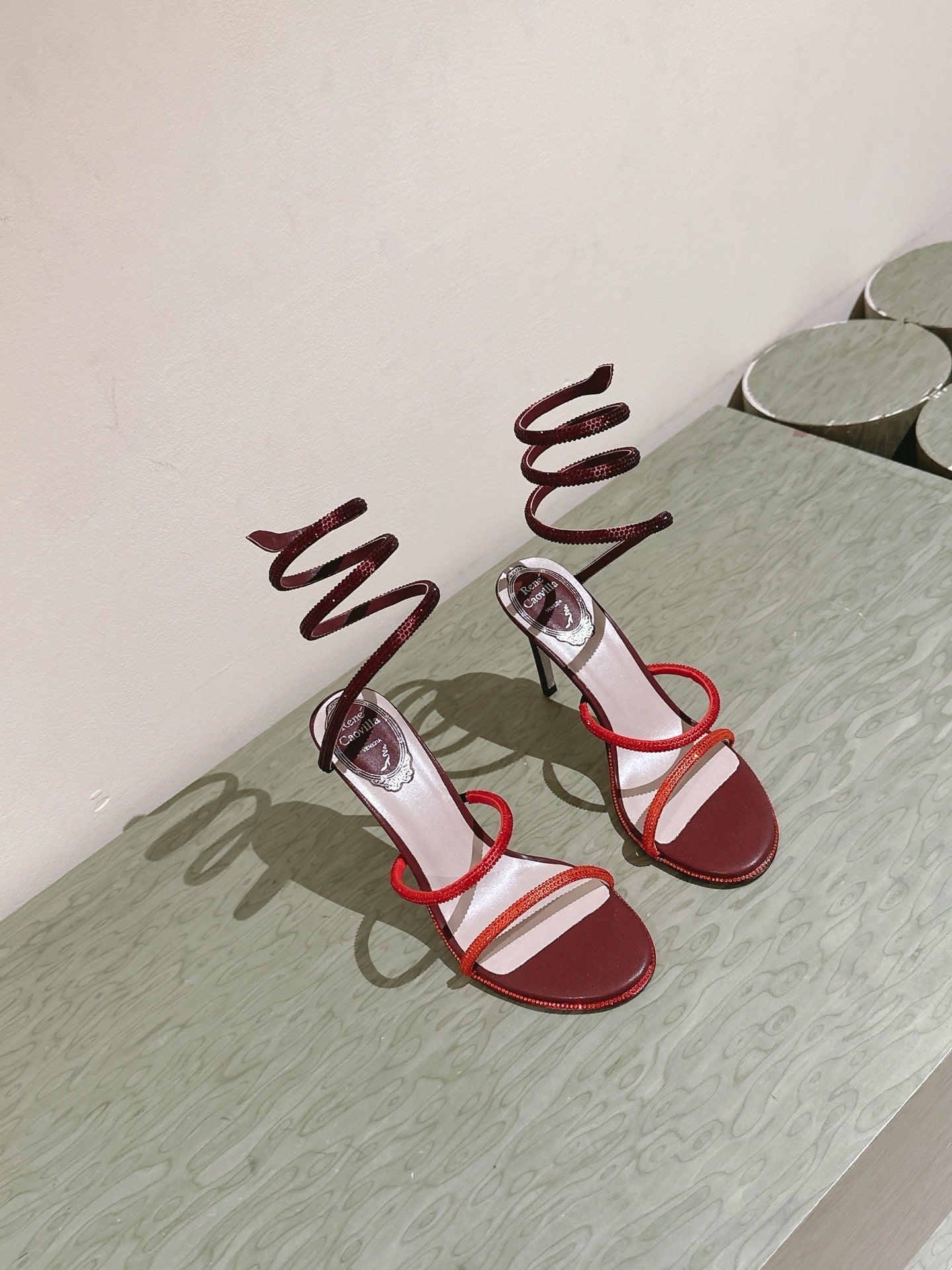 RC 25 Snake-Shaped High-Heeled Sandals Dark Red Silk Rhinestones 268061